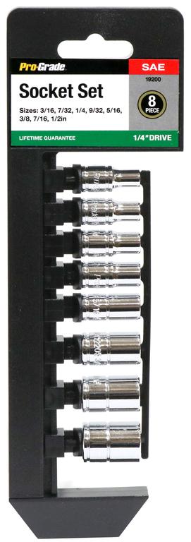 Assortment of the most popular sizes of 1/4"e; Drive 6pt SAE sockets includes 3/16, 7/32, 1/4, 9/32, 5/16, 3/8, 7/16, 1/2"e;