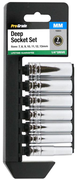 Assortment of the most popular sizes of 1/4? Drive 6pt Deep Metric sockets includes 7, 8, 9, 10, 11, 12, 13mm