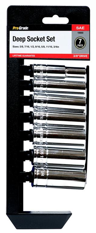 Assortment of the most popular sizes of 3/8"e; Drive 6pt SAE deep sockets includes 3/8, 7/16, 1/2, 9/16, 5/8, 11/16, 3/4"e;