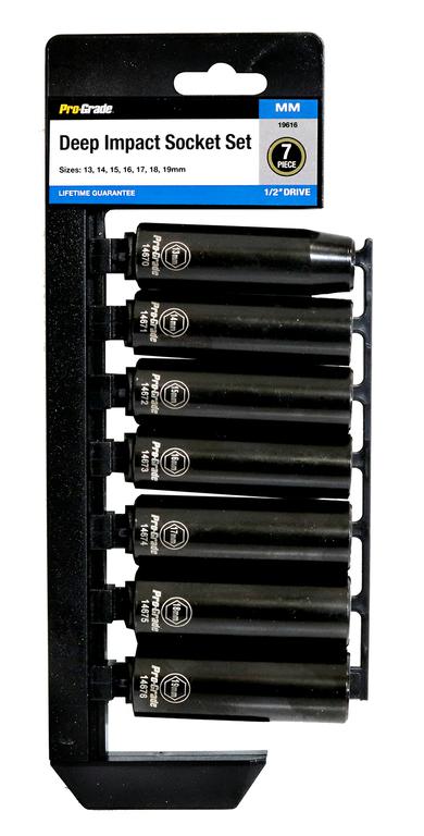 Assortment of the most popular sizes of 1/2"e; Drive Deep Metric Impact sockets includes 13, 14, 15, 16, 17, 18, 19mm