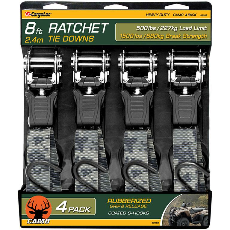 CargoLoc 4 Pc 1"e; x 8' x 1,500lbs Ratchet Tie Down Straps, S-Hooks, DIGITAL CAMO, 32582