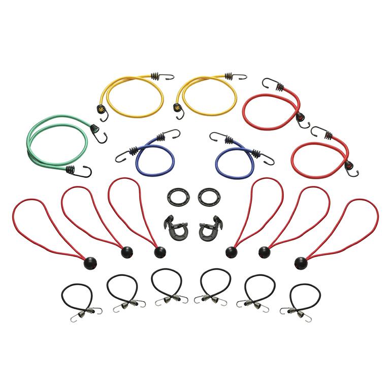 Bungee Cords: (2) 18"e; Blue; (2) 24"e; Red; (2) 30"e; Yellow; (2) 36"e; Green; (6) 10"e; Mini Cords