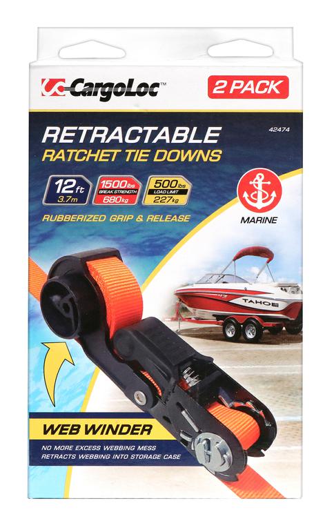 CargoLoc Retractable 2 Pc 1"e; x 12' x 1,500lbs Ratchet Tie Down Straps, S-Hooks - MARINE