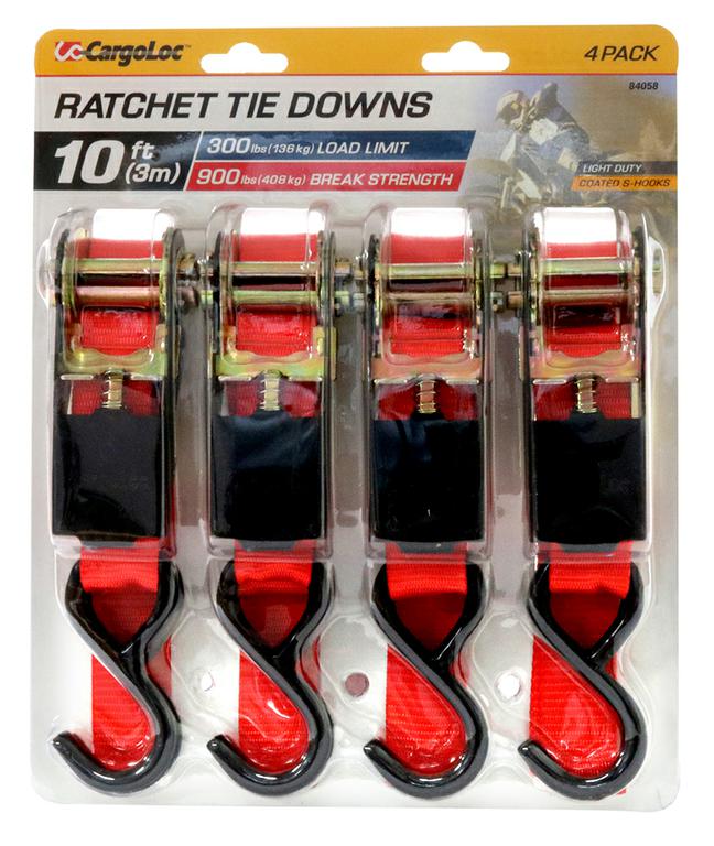 CargoLoc 4 Pc 1"e; x 10' x 900lbs Ratchet Tie Down Straps, S-Hooks, 84058